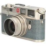 The Leica M6 is a rangefinder camera manufactured by Leica from 1984 to 1998. The M6 combines the silhouette of the Leica M3 and Leica M4 with a modern, off-the-shutter light meter with no moving parts and LED arrows in the viewfinder. Informally referred to as the M6 "Classic" to distinguish it from the "M6 TTL" models, and to indicate its "Classic" M3 dimensions. The top and bottom plates were made from lighter, cheaper magnesium alloy rather than the heavier machined brass of the M3 and M4. The M6 and M6 TTL are mechanical cameras; all functions save the light meter work without batteries, unlike the succeeding M7, which needs electrical power to operate properly. M6 0.85 - 1998. The 0.85 magnification viewfinder was offered on regular production cameras for easier and more accurate focusing with long focal length or wide aperture lenses, such as the 50 mm f/1.0 Noctilux and 75 mm f/1.4 Summilux. The 28 mm framelines are dropped in this model. Only 3,130 of these cameras were made (all black chrome), so they are among the less common regular production of the M6.