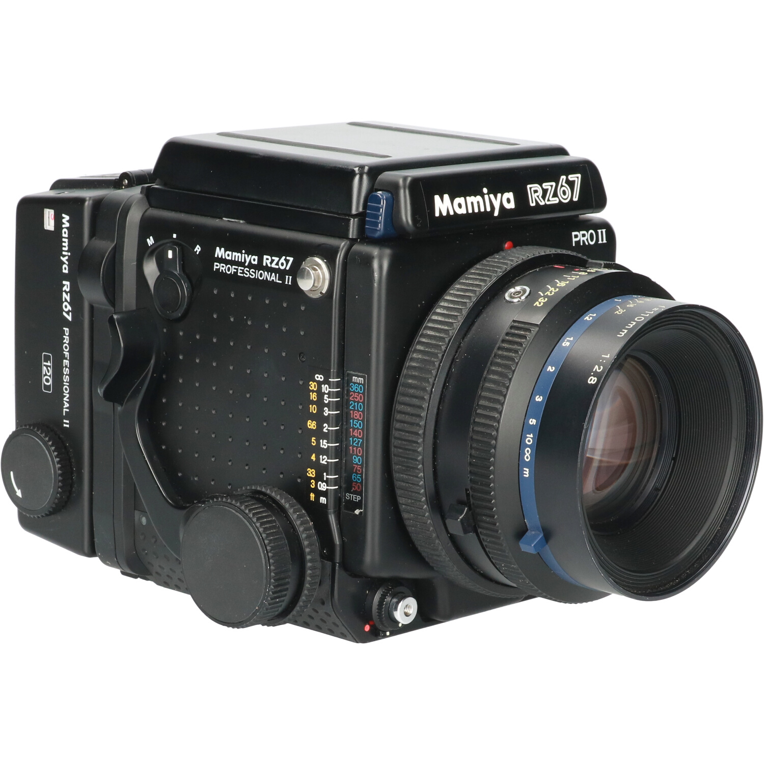 The camera accepts 6×7, 6×6 and 6×4.5, 120 and 220 film magazines and Polaroid as well as Quadra 72 4×5 sheet film backs. Mamiya RB67 backs are also supported via the G-Adapter. The film speed is set on each RZ back via a dial. There are two versions of the 6×7 and 6×4.5 backs; the model II versions have a second film counter to always show the film count on the top. The RZ67 operates on one 6 V silver oxide 4SR44 battery, or 6 V 4LR44 alkaline battery. It can be used in emergency mode fully mechanically with a fixed 1/400 sec shutter speed. Multiple exposures are possible in the M-mode. Mirror flip up is supported. The body has one standard flash hot shoe on its left side, one plug for a standard remote shutter cable release, and a socket for an electronic shutter trigger. The RZ67 measures 104 mm (W) × 133.5 mm (H) × 211.5 mm (L) with the 110mm f/2.8 lens, and weighs approximately 2.4 kg (5.29 lbs). The flange distance is 105 mm.