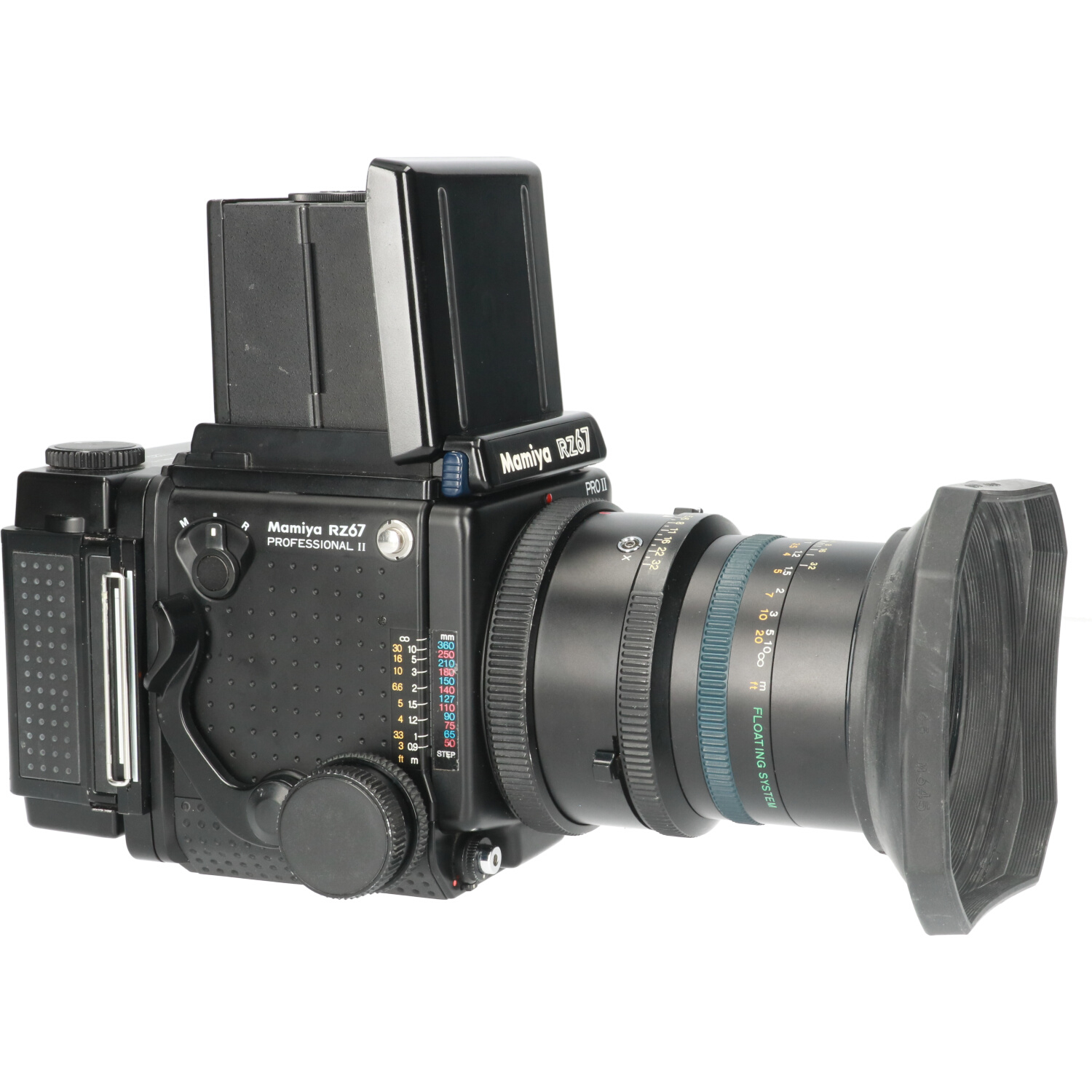 The camera accepts 6×7, 6×6 and 6×4.5, 120 and 220 film magazines and Polaroid as well as Quadra 72 4×5 sheet film backs. Mamiya RB67 backs are also supported via the G-Adapter. The film speed is set on each RZ back via a dial. There are two versions of the 6×7 and 6×4.5 backs; the model II versions have a second film counter to always show the film count on the top. The RZ67 operates on one 6 V silver oxide 4SR44 battery, or 6 V 4LR44 alkaline battery. It can be used in emergency mode fully mechanically with a fixed 1/400 sec shutter speed. Multiple exposures are possible in the M-mode. Mirror flip up is supported. The body has one standard flash hot shoe on its left side, one plug for a standard remote shutter cable release, and a socket for an electronic shutter trigger. The RZ67 measures 104 mm (W) × 133.5 mm (H) × 211.5 mm (L) with the 110mm f/2.8 lens, and weighs approximately 2.4 kg (5.29 lbs). The flange distance is 105 mm.