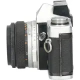 The OM-1 is an all-mechanical SLR. It has a large viewfinder with interchangeable screens but a fixed prism. It also has a through-the-lens exposure meter controlling a needle visible in the viewfinder. It has a compact body, essentially retained on later models. The shutter speed dial is located around the lens mount, which allows photographers to keep the camera at the eye between shots more easily than SLRs with the dial located on the top plate.