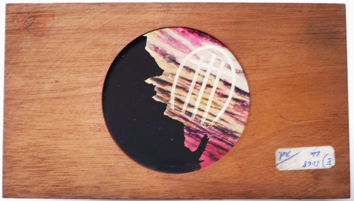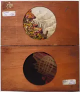 Een set met 2 handbeschilderde Lanterna Magica plaatjes (Toverlantaarn, Lanterne Magique, Toverlantaarn), zogenaamde mistplaatjes of oplossende aanzichten wordt hier aangeboden.