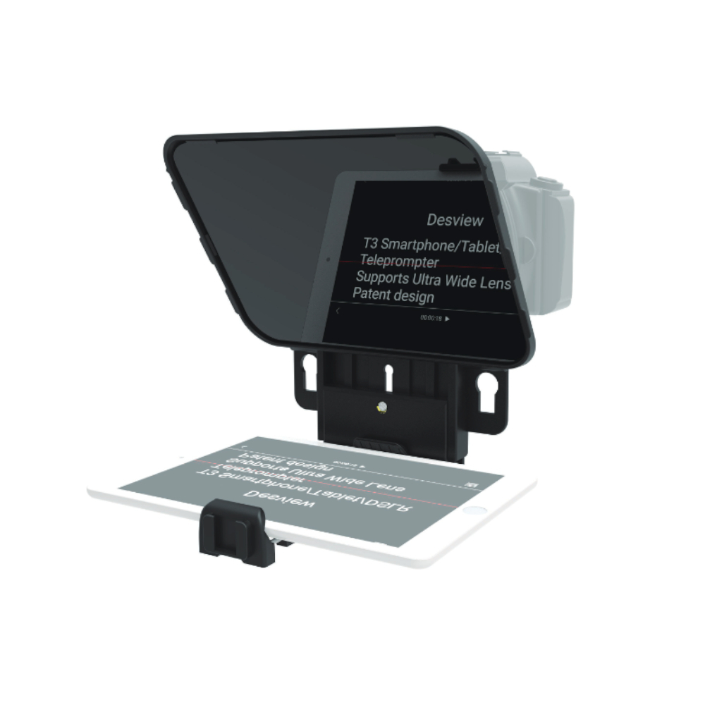 Met de Desview T3 Teleprompter kun je een telefoon of tablet gebruiken als teleprompter. De T3 heeft een spiegel die ervoor zorgt dat jij de tekst op je telefoon kan lezen en de lens in kunt kijken. Zeer geschikt voor gebruik met live streaming of het maken van YouTube video's