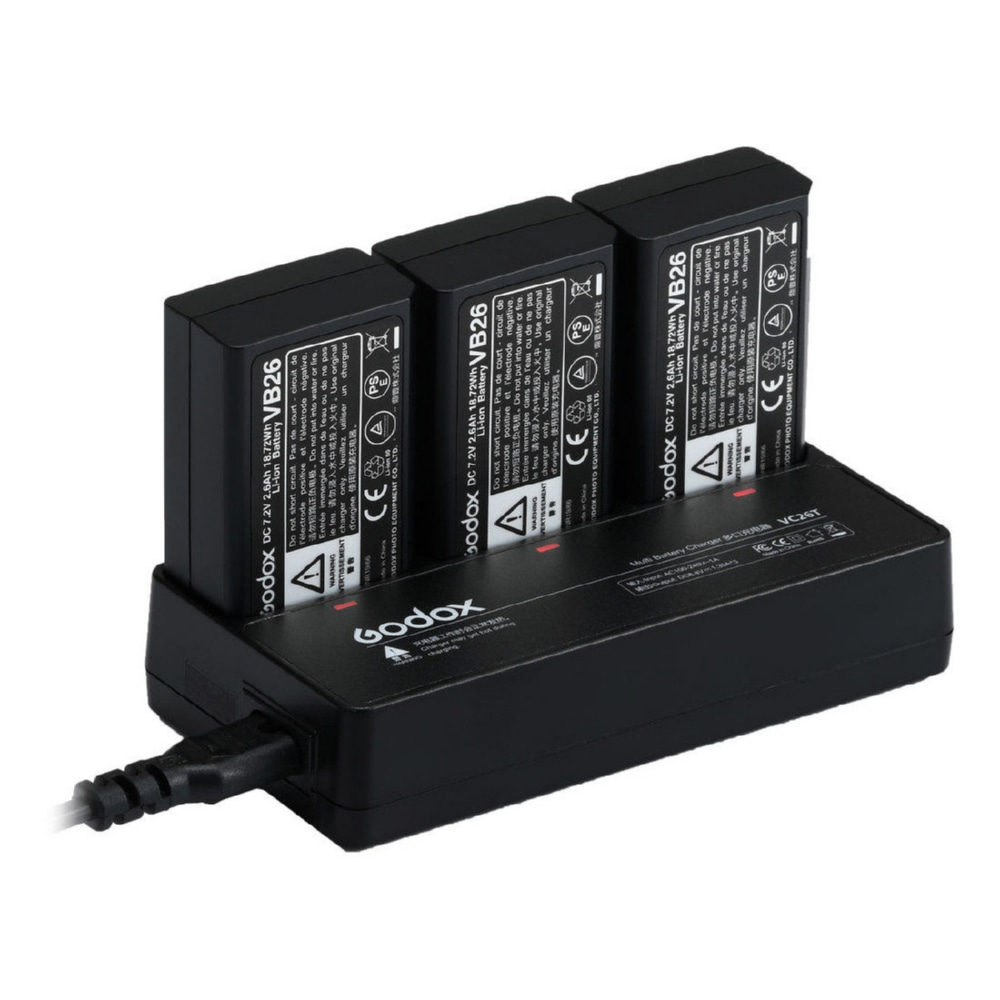 De Godox V1 Multiple Battery Charging Station (VC26T) is een efficiënte en draagbare oplossing om je VB26-batterijen voor de V1- en V860III-flitsers snel weer vol te laden. Hiermee laad je tot drie batterijen gelijktijdig op - een must-have voor fotografen die veel flitsen tijdens lange shoots.