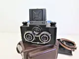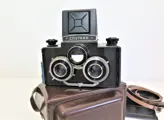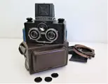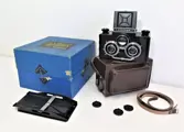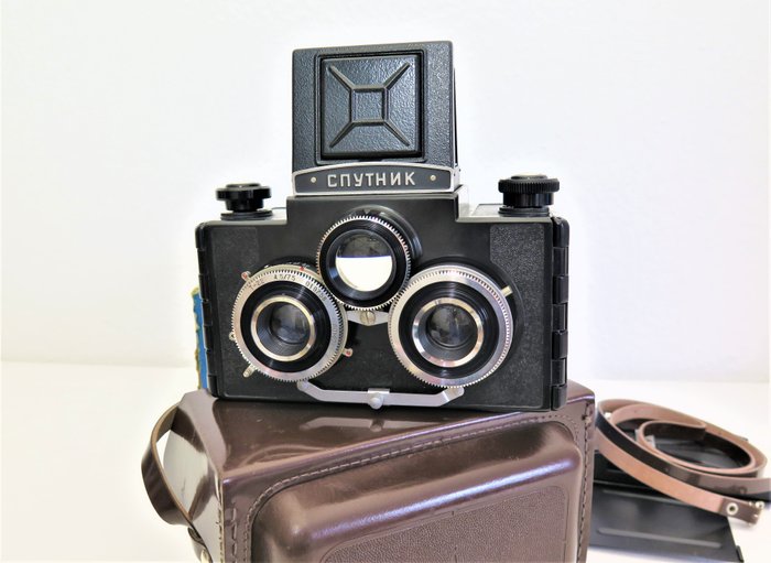 Deze stereocamera van Russische makelij voor 120 mm rolfilm (nog steeds verkrijgbaar) is gemaakt rond 1955-1960. De camera is gemaakt van bakeliet. De optische staat is netjes. De lenzen zijn schoon. De zoeker is helder. De sluiting werkt. Deze prachtige camera wordt geleverd in de originele draagtas en doos; zoals op de foto.