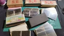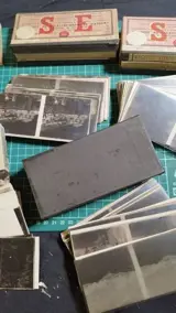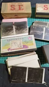 Lot van 59 stereoscopische negatieve glasplaten 6x13 landschappen, familie, brug, vissen, portretten, steden, fietsen, kerk, kippen, bos, honden, koeien, kermis, carrousel, landbouw, sneeuw, bergen, bergbeklimmers...