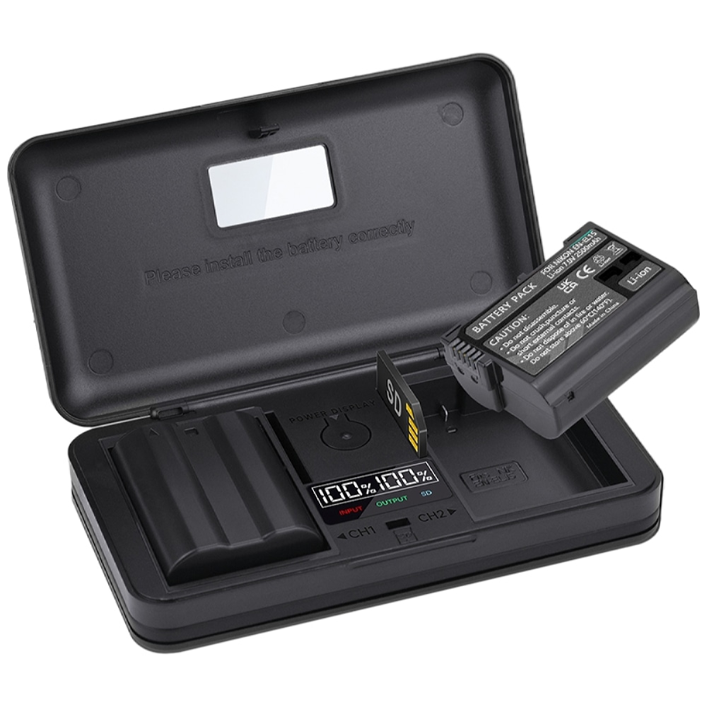 Duocharger voor gelijktijdig laden van twee accu's EN-EL15C via USB kabel. LCD schermpje voor aanduiding laadpercentage van beide accu's. Lader heeft als extra 2x SD Card Reader poorten.