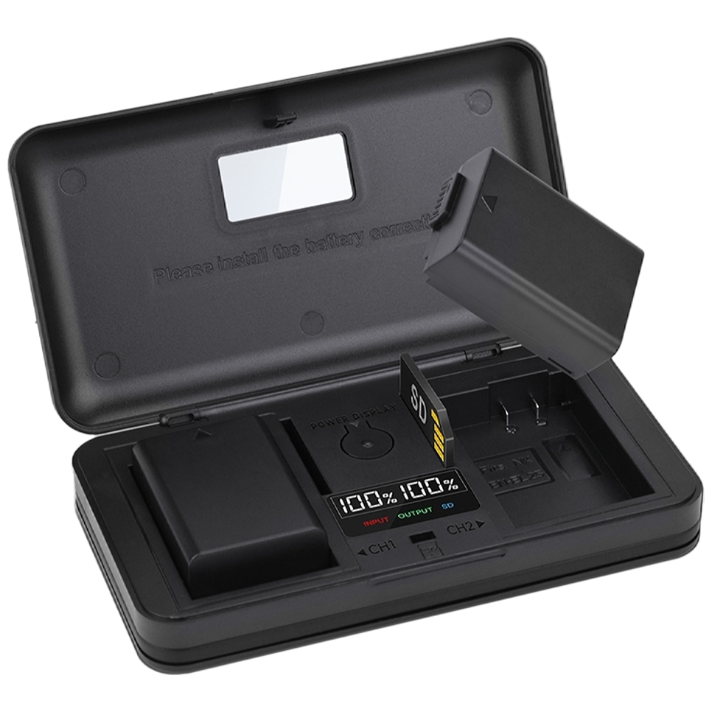 Duocharger voor gelijktijdig laden van twee accu's EN-EL25 via USB kabel. LCD schermpje voor aanduiding laadpercentage van beide accu's. Lader heeft als extra 2x SD Card Reader poorten.