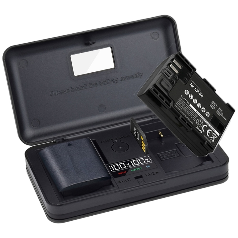 Duocharger voor gelijktijdig laden van twee accu's LP-E6NH via USB kabel. LCD schermpje voor aanduiding laadpercentage van beide accu's. Lader heeft als extra 2x SD Card Reader poorten.