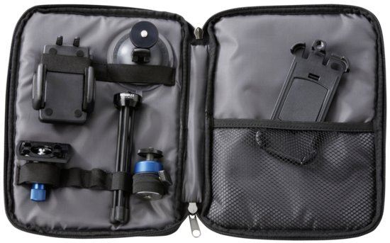 Een speciale Phone Kit voor op het bureau of onderweg. De kit wordt geleverd met een mini statief met balhoofd voor optimale positionering, een zuignap, universele houder, iPhone 4/4s houder en een stevige tas. Met behulp van de zuignap kan hij gemakkelijk in de auto wordt gebruikt. Er kan snel tussen de verschillende houders gewisseld worden dankzij het speciale bevestigingsmechanisme.