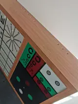 Gemaakt van hout, het glas is opaline met zwarte letters.
