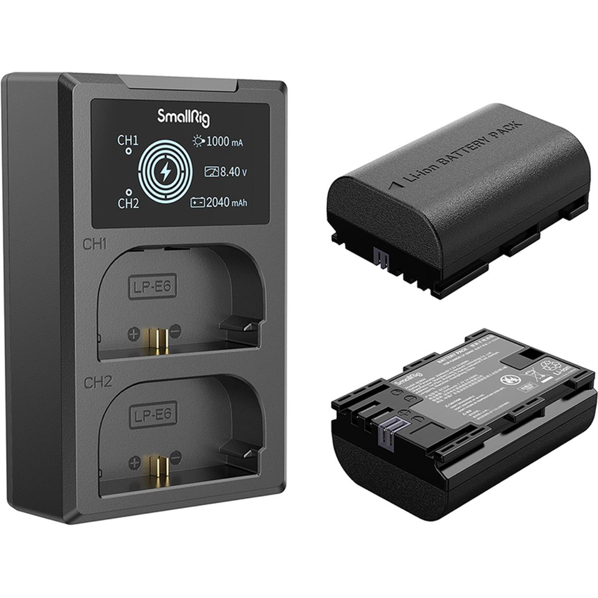 De SmallRig 3821 LP-E6NH Camera Batterij en Oplaad Kit bevat twee accu's en een lader. De batterij, uitgerust met een volledige decoderingschip, ondersteunt perfect gevarieerde camera's zonder pop-up vensters te veroorzaken en heeft een vuurvaste ABS en PC omhulsel van hoge kwaliteit om een fijne aanraking en duurzaamheid te garanderen. De dubbele batterijlader kan twee batterijen tegelijk opladen, waarbij het LCD-scherm het laadvoltage, de stroom en de opgeladen capaciteit in real time weergeeft. De lader wordt geleverd met een ingebouwde USB-A-oplaadkabel en USB-C-ingang, zodat hij kan worden opgeladen via een USB-adapter, autolader of powerbank.