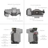 Deze cage is uitgerust met diverse montagemogelijkheden, waaronder 1/4"-20 en 3/8"-16 schroefdraad, ARRI-locatiepunten, een NATO-rail en een afneembare cold shoe mount. Daarnaast beschikt de cage over een QD-socket en riemgleuven voor extra draagopties.