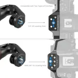 De handle beschikt over meerdere 1/4"-20 en 3/8"-16 schroefgaten, ARRI-locatiepunten en een cold shoe mount. Dit maakt het mogelijk om accessoires zoals een monitor, microfoon of lamp direct te bevestigen, waardoor je rig overzichtelijk en compact blijft.