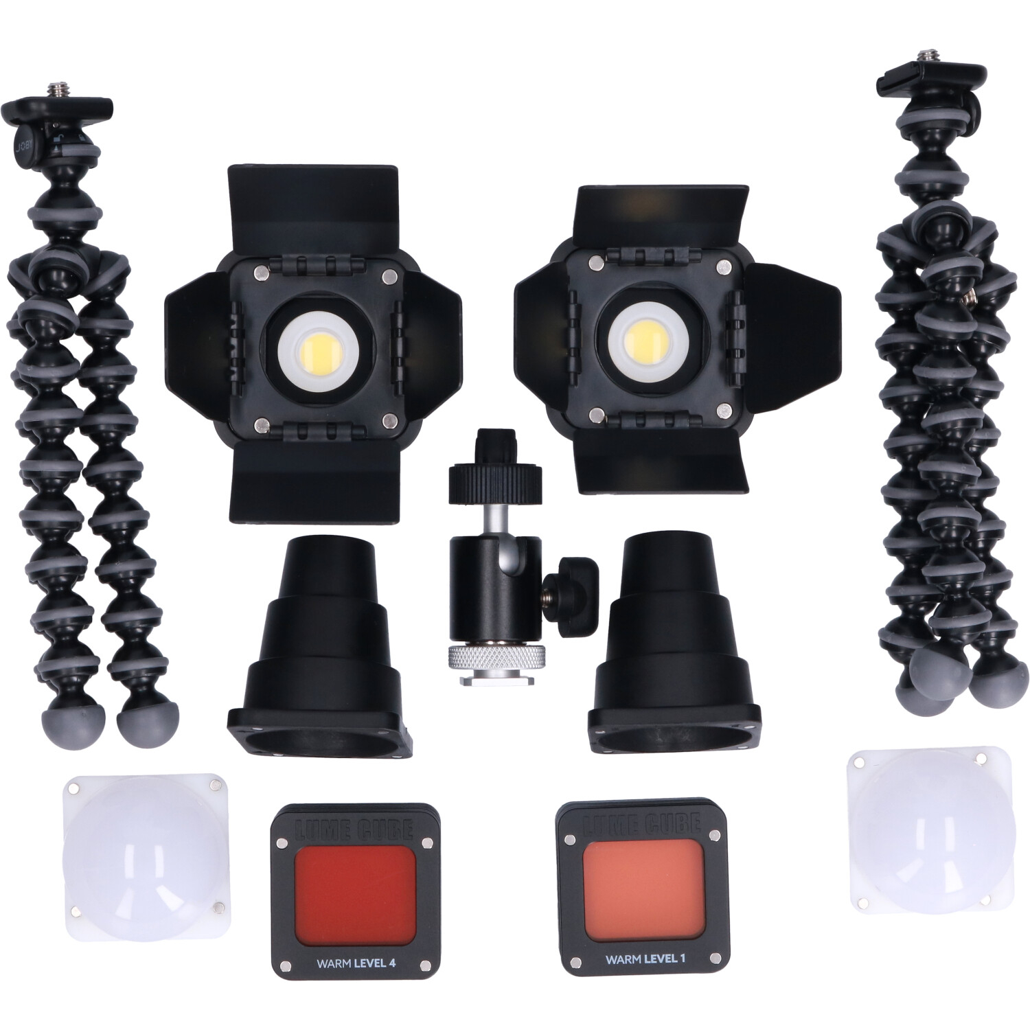 Deze kit bevat twee Lume Cubes 2.0 met bijbehorende filters en diffusors. Het geheel wordt geleverd in een handige beschermcase met rits, waarvan het interieur op maat gemaakt is voor de Lume Cubes, de gels en diffusors. De hoes biedt bescherming en zorgt er tegelijk voor dat de gehele kit gemakkelijk en compact mee te nemen is.