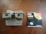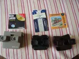 3 viewmaster-stereoscopen 1 model H gaf met hoezen van 3 maanlandingsschijven 1969, 1 model C made in usa met 6 sawyer-schijven 81 Niagara Falls, 128 Yellowstone, 205 Duluth en North Shore Drive, 221 Los Angeles, 253 Carlsbad Caverns en de Bahama's ( bubling) 1 model E made in belgium met een hoes van 3 schijven disneyland frontierland