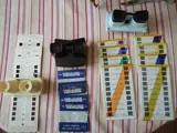 vereniging van 3 stereoscopen made in france, 1 viewmaster model E uit 1957 met 6 schijven, 1 suprex lestrade (model met focus) met 8 kaarten van 10 views: les floralies d'orléans (1967) 4 kaarten the liner france 2 kaarten, 2 tentoonstellingskaarten van beroemdheden reclamekaarten van de E.P.I.1 romo standaard ivoor met 3 kaarten van 12 weergaven, de cote d'azur, baard bleu en bob mounty (met in de hoofdrol de jonge jack higelin!)