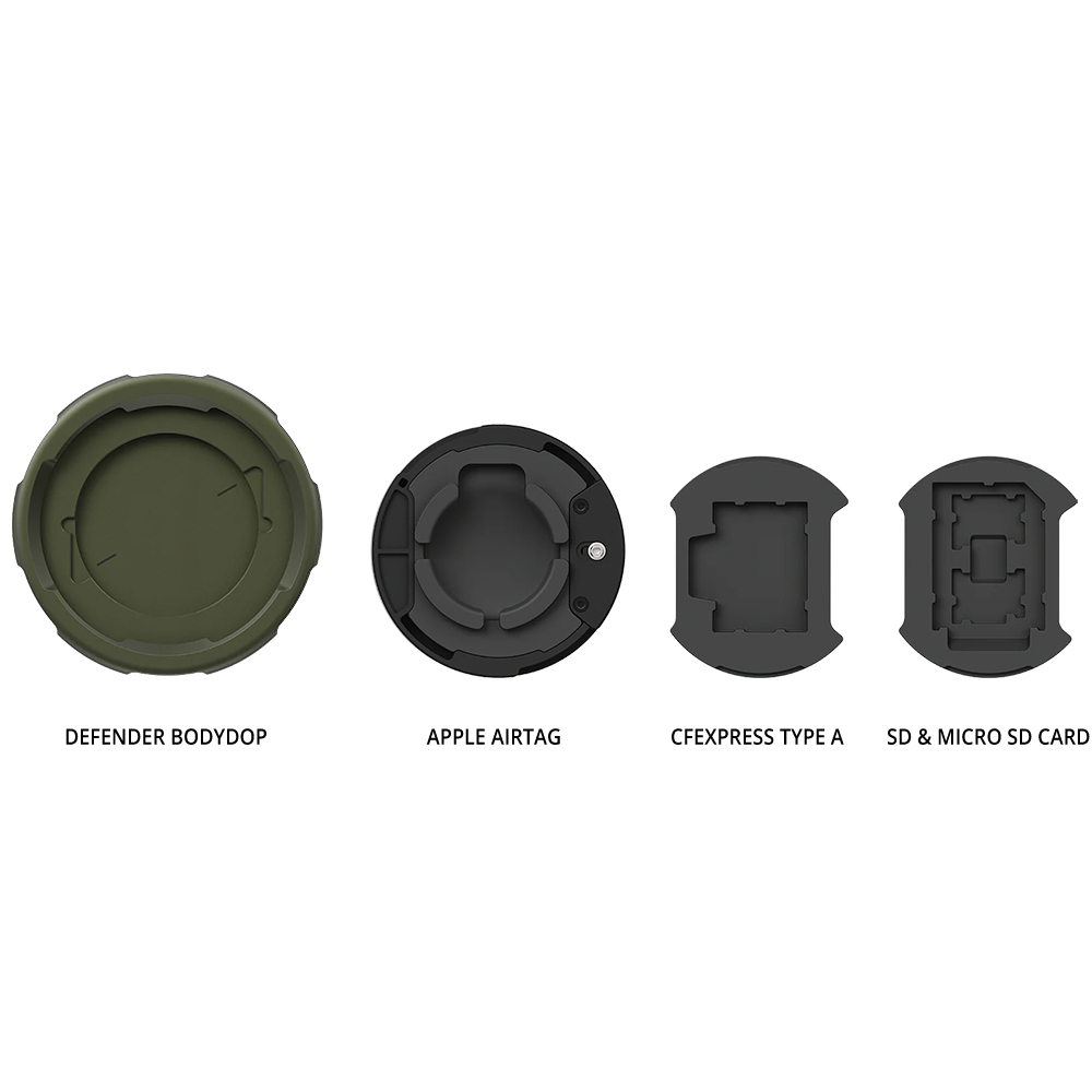 Wees er zeker van dat je sensor veilig is met de Defender Body Cap. Naast bescherming biedt hij een verborgen vakje voor een AirTag, SD-kaart of CFexpress A-kaart.