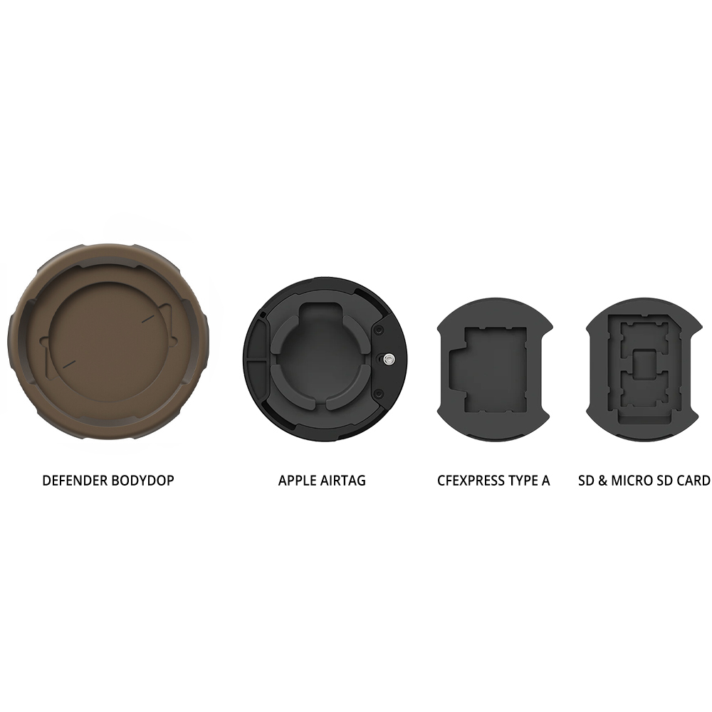 Wees er zeker van dat je sensor veilig is met de Defender Body Cap. Naast bescherming biedt hij een verborgen vakje voor een AirTag, SD-kaart of CFexpress A-kaart.