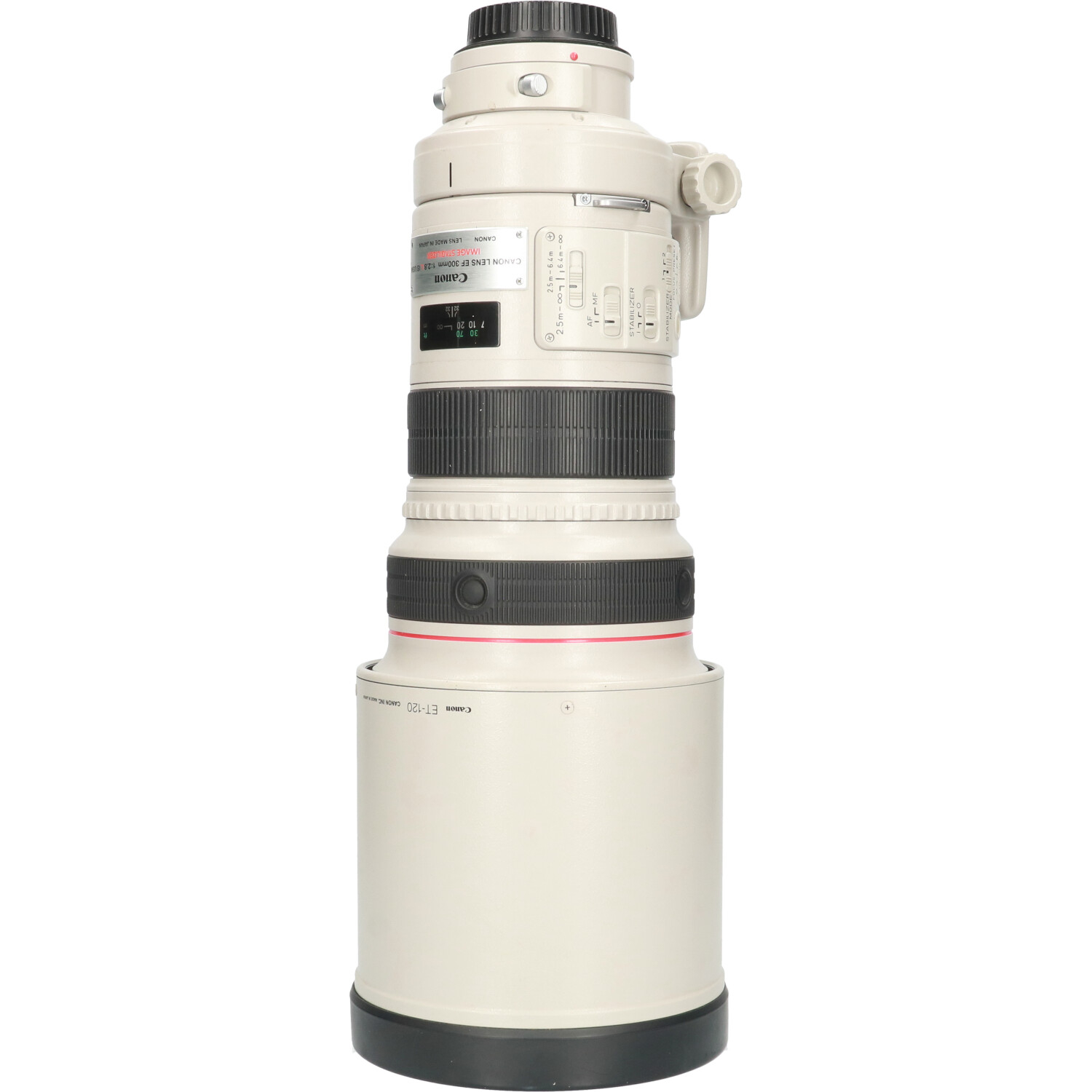 Large-aperture telephoto L lens with a camera shake correction function, which is best suited to shooting by holding the camera with hands Developed as a successor to the EF300mm f/2.8L USM. A fluorite lens and two UD lenses are used in the optical system to assure very high picture quality. This lens has also a protection glass and a rear filter as standard, which are included in the number of lenses. The camera shake correction has an effect of approx. two stops* in terms of shutter speed. This lens has also "camera shake correction mode 2" which corrects shaking of the viewfinder image when, for example, shooting a moving object, and a tripod can be used with the camera shake correction function ON. High-speed autofocusing is achieved by the weight reduction of the group of focusing lenses and improvement of the autofocusing drive algorithm. A new AF stop function, which stops autofocusing temporarily, is adopted. Manual focusing is performed mechanically to save power. Main components are made of a magnesium alloy to reduce the weight of the lens, including the optical system, making it much lighter than conventional lenses. Rubber parts are used as mount and switch components to achieve excellent dust- and drip-proofness. The tripod mount can be removed, and the drop-in filter 52 (standard), carbon fiber hood, and suitcase-type lens case are designed to be easy to use.
