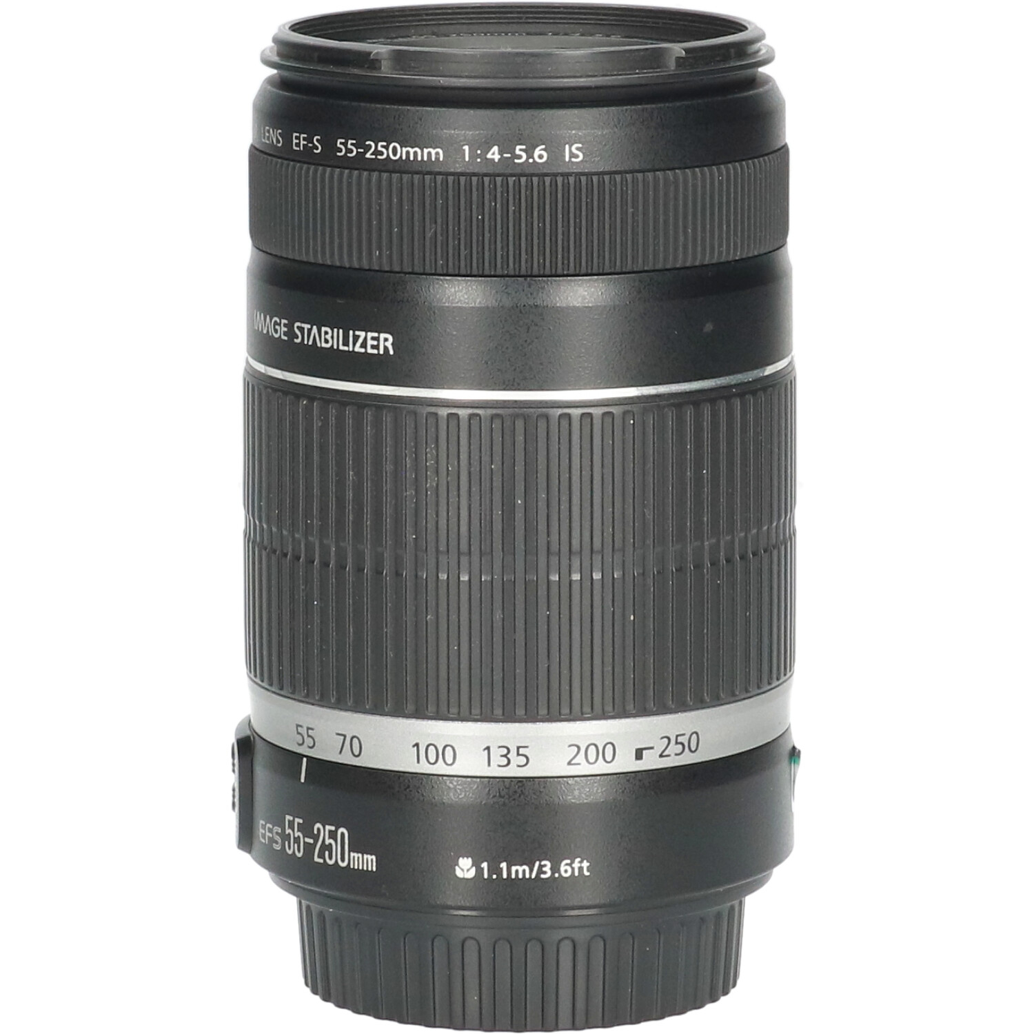 The “EF-S55-250mm F4-5.6 IS” is a telephoto zoom lens with a very small Image Stabilization (IS) unit. Image stabilization reduces blur due to camera shake by the equivalent of about four shutter-speed steps*, while maintaining excellent cost effectiveness. The inclusion of a UD (ultra-low dispersion glass) element in the design provides excellent aberration correction, and ensures excellent image quality at all focal lengths. The closest focusing distance is 1.1m at all focal lengths, and the zoom-ring pattern and coating used on our high-end models is used resulting in a firmer grip and a high-grade exterior finish.