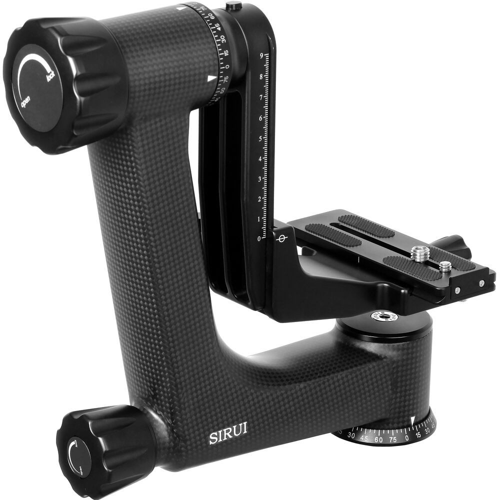 De 25 cm hoge Sirui PH-30 Carbon Fiber Gimbal Head kan een camera en een grote telelens die tot 25 kg weegt gemakkelijk en soepel kantelen en draaien, zodat hij snel bewegende onderwerpen kan volgen, zoals bij sport- of vogelfotografie. Bovendien kantelt de kop van -60 tot 150° en draait hij een volledige 360°, terwijl het platform 90° in hoogte verstelbaar is. Zowel de kanteling als de rotatie kunnen worden vergrendeld via de vergrendelknop van de kanteling en de onafhankelijke panvergrendelknop.De 1.4 kg gimbalkop is gemaakt van een 8-laags koolstofvezelweefsel, en het platform is gemaakt van een lichtgewicht aluminium materiaal. Bovendien is het platform compatibel met het Arca-type, en bevat het een snelkoppelingsplaat met zowel 1/4"-20 als 3/8"-16 camera montage schroefdraad.