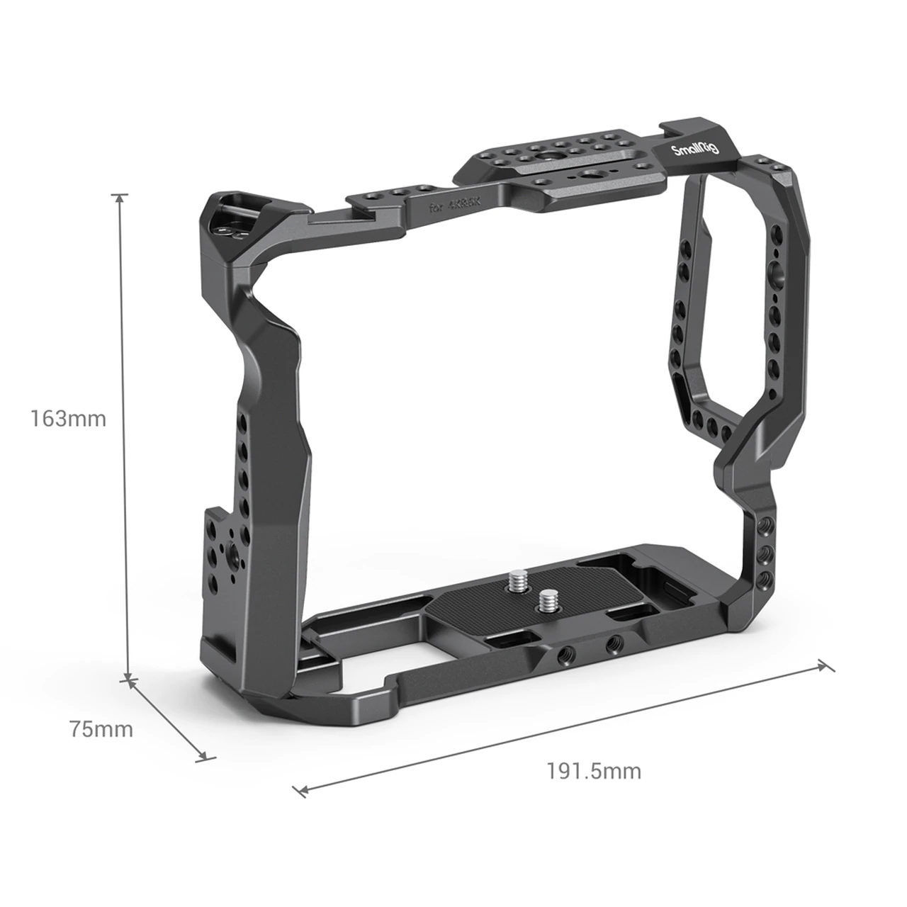SmallRig 2765 heeft meerdere 1/4 "-20 en 3/8" -16 schroefdraadgaten, Arri-type montagepunten, twee NATO-rails en drie koude schoenen voor het bevestigen van accessoires. De kooi heeft een riemgleuf om de nekriem te bevestigen.