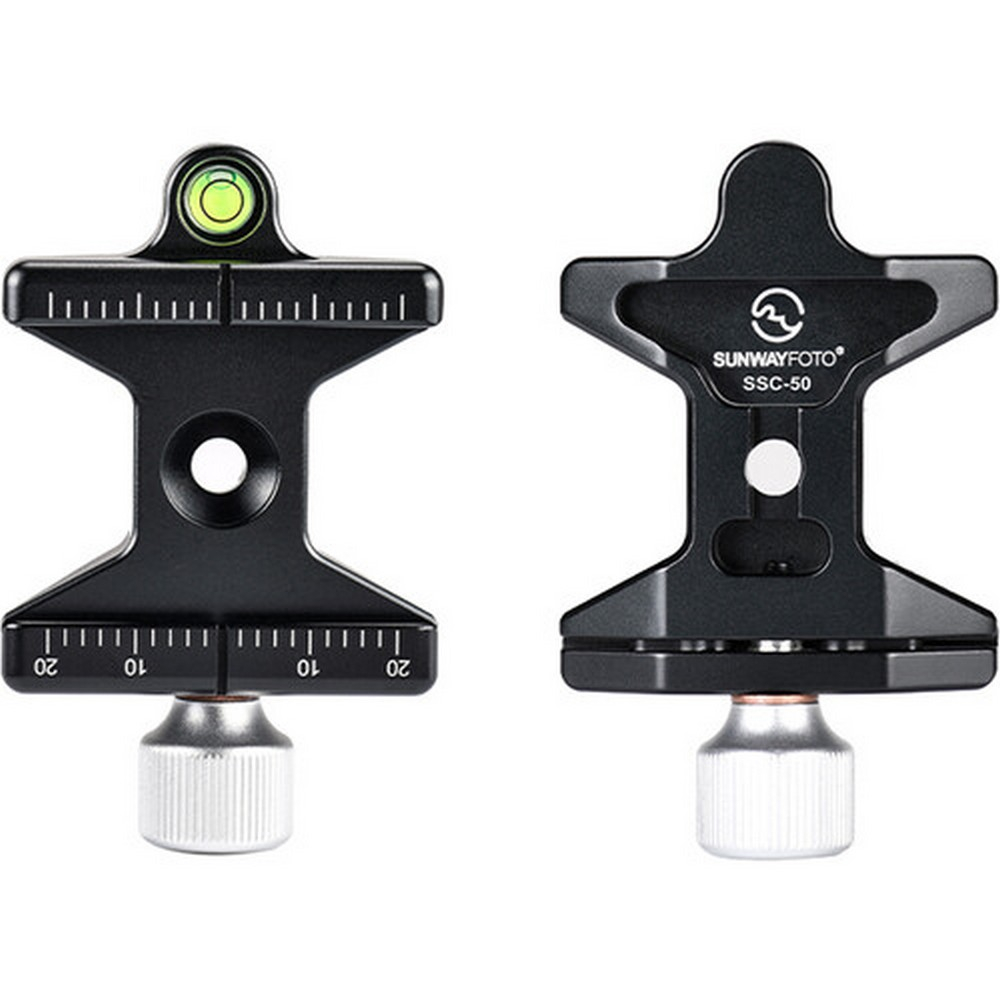 De Sunwayfoto SSC-50 Universal Arca Standard 50 mm QR-klem kan op de meeste balhoofden worden bevestigd met behulp van een meegeleverde M6-schroef. Het wordt in de schroefdraad aan de bovenkant van de bal van het hoofd geschroefd. De SSC-50 heeft een minimalistisch ontwerp, waarbij onnodige onderdelen op de juiste plaatsen zijn weggesneden, waardoor hij relatief lichter en compacter is. Het ondersteunt alle Arca standaard snelkoppelingsplaten en heeft aan de ene kant een knop om de plaat vast te zetten en heeft een waterpas aan de andere kant.