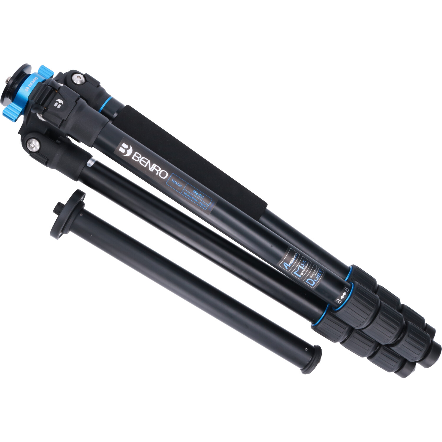 De poten zijn in drie verschillende standen - tot nagenoeg plat - vast te zetten. De Mach 3 wordt standaard geleverd met een korte middenkolom waardoor er ook heel laag bij de grond gefotografeerd kan worden. Uiteraard is ook de middenkolom om te draaien waardoor de camera midden onder het statief kan worden bevestigd.
