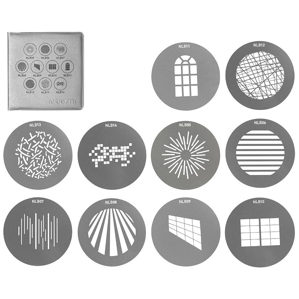 De Nanlite Gobo Set 1 is een verzameling van 10 goboschijven die volledig compatibel zijn met de FM mount Projection Attachment. Het bevat 3 afzonderlijke venstertypen: gebogen, dubbel en hoekig, en handige patronen zoals een lineaire reeks en andere uiteenvallen. Gebruik ze om meeslepende achtergronden, overtuigende schaduwen en reflecties en talloze andere effecten te creëren.