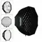 De binnenzijde is zilver reflecterend, gecombineerd met een diffuser die het licht zacht en gelijkmatig verspreidt - ideaal voor portret- en product fotografie. De inbegrepen grid (honeycomb) helpt ongewenste lichtverspreiding te beperken en richt het licht precies waar je het nodig hebt.