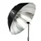 Een paraplu met zilveren coating aan de binnenkant geeft een hardere, gerichte reflectie. Je licht is meer gebundeld en minder diffuus dan wanneer je een witte paraplu zou gebruiken. Het verschil tussen schaduwen en higlights wordt groter, ideaal om de structuur van materiaal goed te belichten.