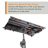 Deze adapter is volledig compatibel met het TetherTools AeroTrac Workstation System en kan eenvoudig worden bevestigd aan AeroTrac-rails, tafels of statieven. Hierdoor kun je je werkstation uitbreiden met extra montagepunten voor verlichting, camera's of andere apparatuur, zonder dat je extra houders of standaarden nodig hebt.