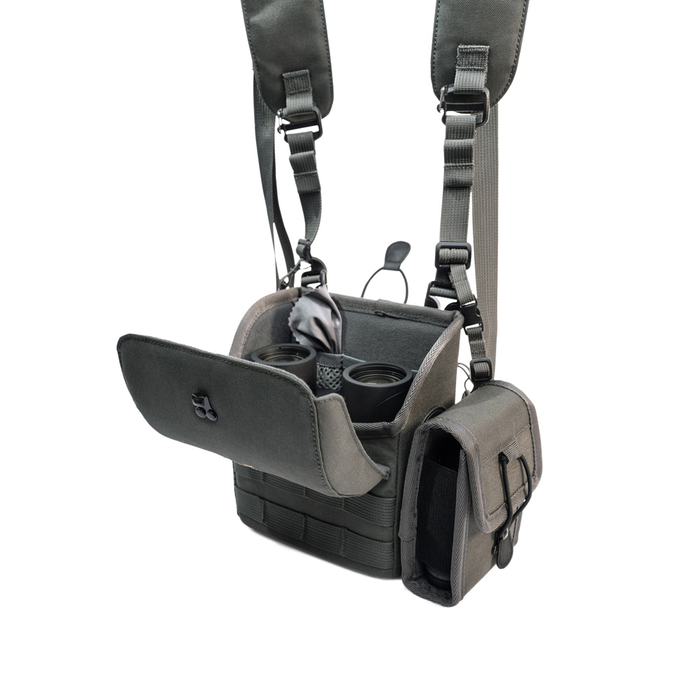 De GPO Bino Harness PRO is de perfecte oplossing voor avonturiers die op zoek zijn naar een duurzame en functionele harnasoplossing voor hun verrekijker. Gemaakt van robuust 500D Nylon MOLLE, biedt dit harnas bescherming en zorgt het ervoor dat je verrekijker altijd binnen handbereik is. Met een geïntegreerde regenhoes en diverse vakken voor accessoires, zoals een afstandsmeter of smartphone, is het harnas ideaal voor gebruik in het veld. Comfort wordt gegarandeerd door het anti-zweet mesh en de stille, snelle losmaaksystemen.