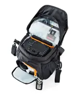 De zeer complete Nova 140 AW II cameratas is eigenlijk een soort gereedschapskist voor fotografen. Deze fototas heeft een aantal unieke eigenschappen, zoals een dubbele sluiting met degelijke, waterproof ritsen én een clipsluiting. Die clipsluiting komt van pas als je tussen de fotomomenten door geen tijd wilt verliezen met het sluiten van de ritsen. Aan de binnenkant van het deksel zijn speciale vakjes voor geheugenkaarten en een mobiele telefoon te vinden en de voorzijde heeft een ruim vak voor extra accessoires zoals reserveaccu's of een handleiding. Lowepro heeft aan de zijkant van de Nova 140 AW II bovendien gaasnet zijvakken aangebracht die perfect geschikt zijn om bijvoorbeeld een extra draagriem in mee te nemen. De ingebouwde all weather regenhoes beschermt je kostbare fotospullen tegen slecht weer, terwijl je apparatuur ook met de regenhoes om je tas gewoon bereikbaar is.