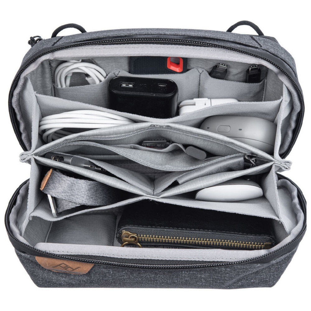 De Peak Design Tech Pouch V2 in Charcoal is een handige 2L organizer voor al je tech-accessoires. Deze pouch is onderdeel van het Peak Design Travel-Series systeem en beschikt over een waterbestendige rits. De clamshell-configuratie biedt vijftien binnenvakken voor het opbergen en organiseren van batterijen, geheugenkaarten, harde schijven, kabels en adapters. Een extern ritsvak biedt gemakkelijke toegang tot je paspoort of telefoon, terwijl een doorvoer voor een voedingskabel zorgt dat je apparaten onderweg opgeladen kunnen blijven.