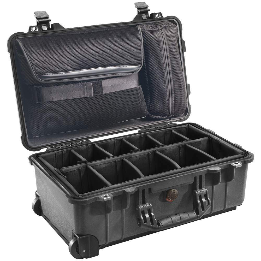 De Peli 1514 is een volwaardige Peli Trolleykoffer met wielen en een uitschuifbare handgreep. Hij wijkt af van de Peli 1510 door het gebruik van dividers in plaats van Peli Pick 'N' Pluck schuim en biedt bovendien ruimte om een laptop mee te nemen. Deze onverwoestbare koffer is ideaal om allerhande zaken vocht-, stof- en schokbestendig overal heen te vervoeren. De buitenmaten zijn 55,9 x 35,1 x 22,9cm en de binnenmaten van 50,2 x 27,9 x 19,3cm geven de ruimte aan bijvoorbeeld een complete dslr-uitrusting en een laptop of tablet van maximaal 18". Bovendien mag dit formaat bij bijna alle vliegtuigmaatschappijen mee in de handbagage. De Peli 1514 Studio Case weegt 6,2 kilo en is uitgevoerd in zwart. Op verzoek is er een gepersonaliseerd naamplaatje leverbaar.