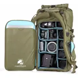 De groene Action X70 HD rugzak van Shimoda Designs biedt fotografen een ruime en duurzame draagoplossing met een capaciteit van 70 liter. De rugzak biedt snelle toegang tot je uitrusting, waardoor hij ideaal is voor actieve opnamesituaties. De rugzak heeft twee gewatteerde vakken die laptops of tablets tot 16" veilig kunnen opbergen en beschermen. Dankzij de rolsluiting kun je het volume eenvoudig vergroten of verkleinen, afhankelijk van je specifieke behoeften. De rugzak heeft ook meerdere bevestigingsriemen, waaronder TPU compressiebanden voor extra duurzaamheid bij het bevestigen van grote voorwerpen zoals ski's. Daarnaast is er een afneembare helmhouder inbegrepen, zodat je een fiets- of skihelm aan de buitenkant van de rugzak kunt bevestigen.