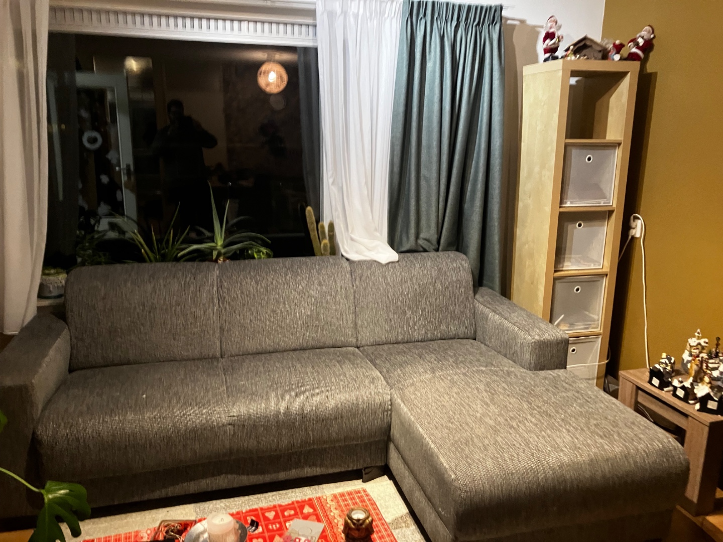 een grijze hoekbankNog in goede staat kan nog een ronde meeZit nog prima niet door gezaktdoe hem weg IVM nieuwe bankbreedte 230zit diepte 60hoogte 40hoekstukbreed 60