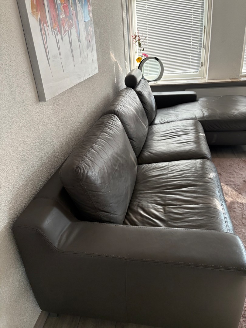 Mooie en comfortabele lederen hoekbank van Lederland. In uitstekende staat. Kan nog jaren mee.De bank biedt veel zitruimte en past perfect in een modern interieur. De kleur is grijs/antraciet en het leer is van hoge kwaliteit. Perfect voor een gezin Het is een ijzersterk leer soort.