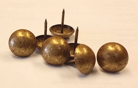 Siernagel oud goud gevlektMet een bolkop rond 20 mm. Lengte spijkerpunt 20 mm.500 stuks in doos.Prijs is per doos