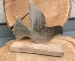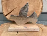 Deze schattig vogel van aluminium staat op een houten voet.