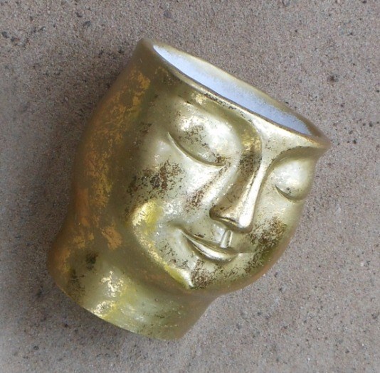 Grote goudkleurige bloempot in de vorm van een gezicht.