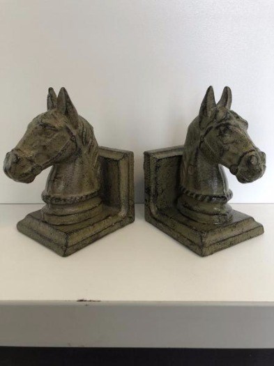 Set van 2 boekensteunen met de prachtig beeldjes van paardenhoofden, mooi gedetailleerd in de kleur antiek groen.
