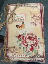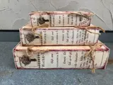 Prachtige oude kleuren decoratie boeken met de tekst Flore des Jardenier, lijkt alsof de boeken in boekbinderslinnen gebonden zijn. De 3 delige set zijn kistjes waarin eventueel nog wat opgeborgen kan worden. Ook passen de boeken precies de daaropvolgende doos.