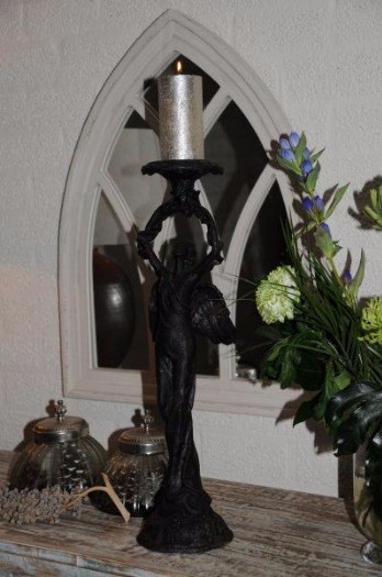 Engel die centraal staat bij deze prachtige vol metalen kandelaar in de kleur zwart-rust.