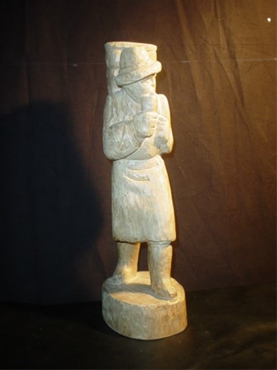 Houten beeldje van Duitse wijnboer met oogstmand op de rug.