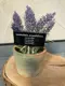 Met de hand vervaardigde aged terra cotta pot waarin een -niet van echt te onderscheiden- kunststof lavendelplant en een plantensteker.
