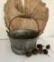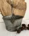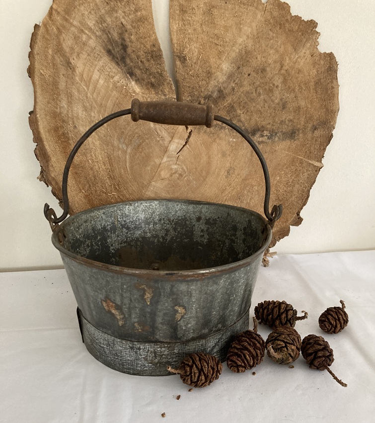 Oude ijzeren emmer met leuke details zoals geklonken naden en oud handvat aan zwaar metalen hengsel.