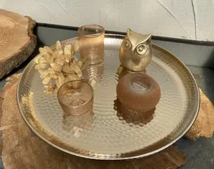 Grote en robuuste schaal van metaal in gehamerd nikkel vormt een mooie basis om diverse woonaccessoires op te etaleren en te decoreren. Combineer deze schaal bijvoorbeeld met een mooie grote krans en een gezellig windlicht of vaasjes uit ons assortiment.