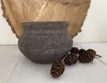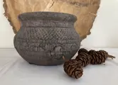 Zeer decoratieve pot met veel verschillende structuren, in oud look bruin.